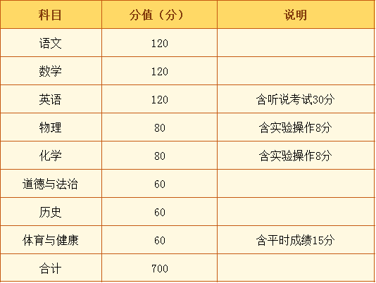 2023年中考招生录取计分科目为语文、数学、英语、物理、化学、道德与法治、历史、体育与健康共8个科目。与往年相比,增加了道德与法治、历史两个计分科目,中考总分由605分调整为700分。语文、数学、英语均按120分纳入中考总分,其中,英语包含30分的听说考试成绩;体育与健康考试成绩从45分提高到60分;物理、化学科目均为80分,其中实验操作各占8分;道德与法治、历史均为60分。