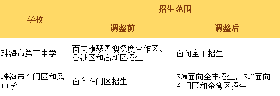 在招生范围调整方面,与去年相比,珠海市第三中学、珠海市斗门区和风中学招生范围均有所扩大。具体为: