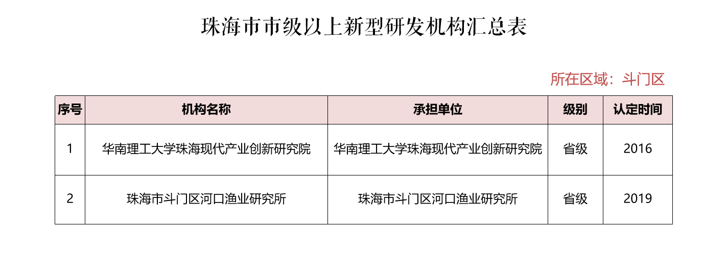 珠海市市级以上新型研发机构汇总表(截至2022年3月--斗门区)