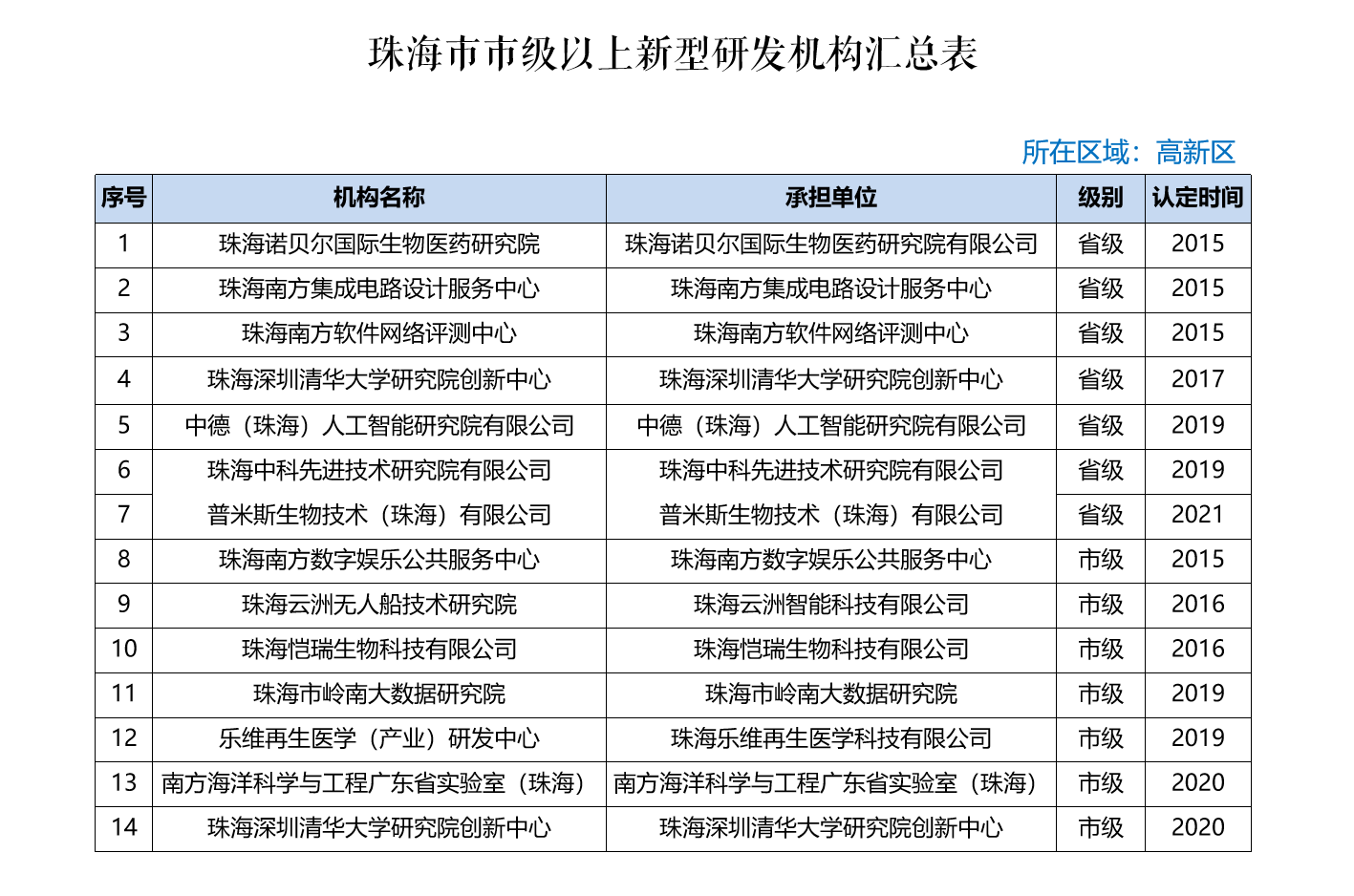 珠海市市级以上新型研发机构汇总表(截至2022年3月--高新区)